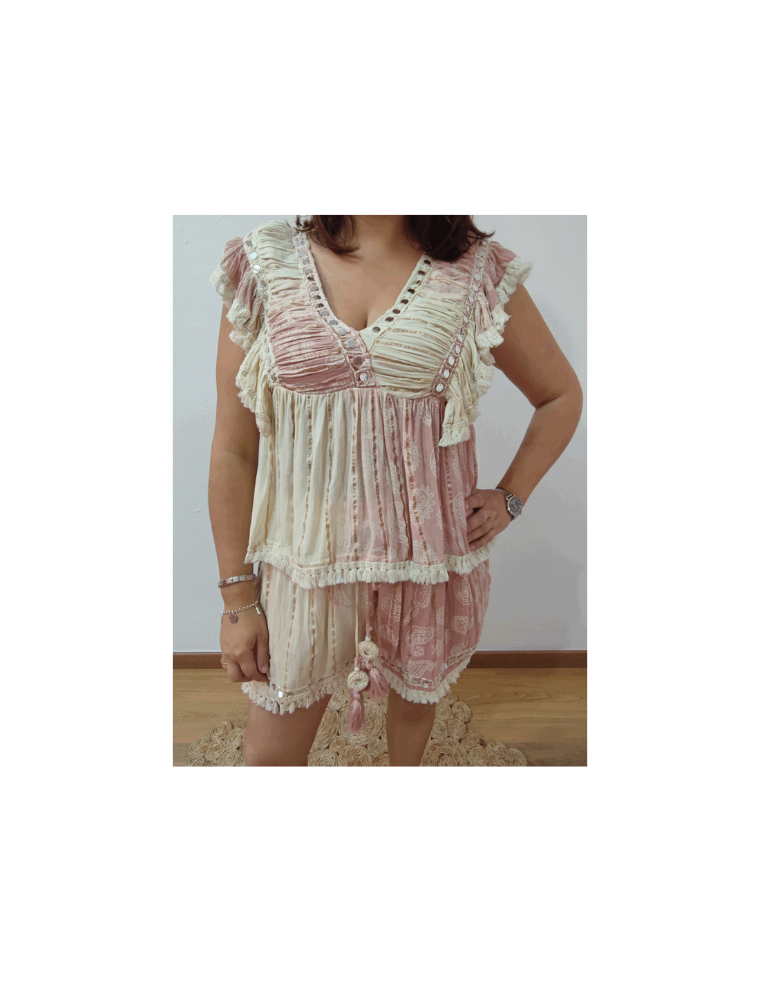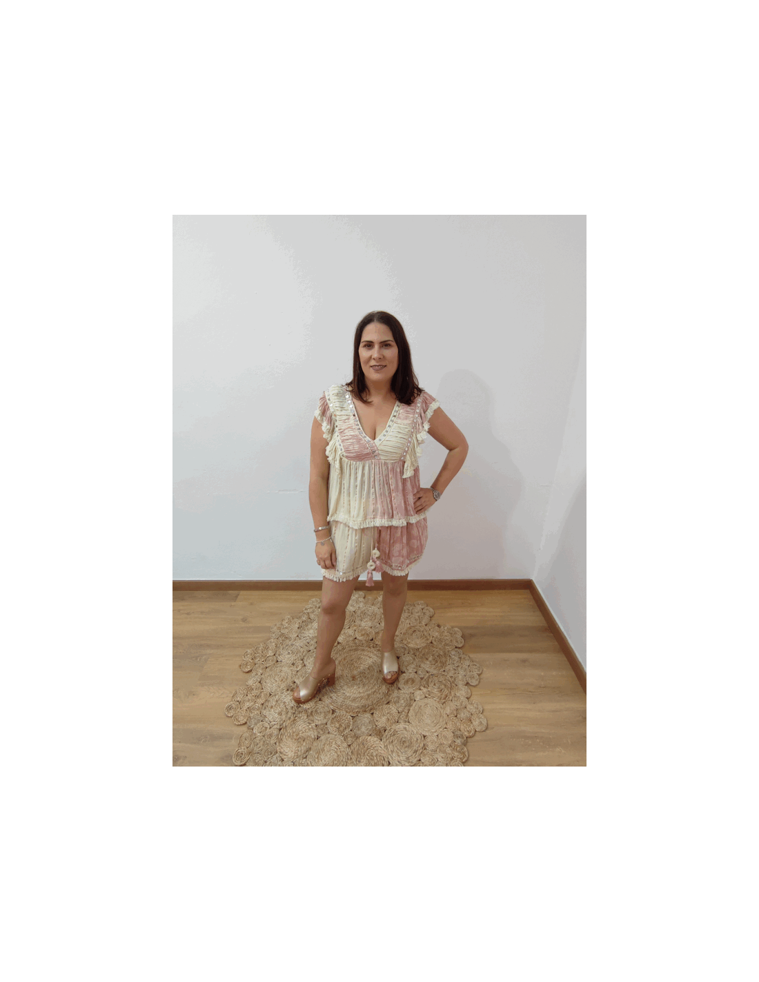 El top presenta un diseño de volantes tipo mariposa con detalles de encaje y mini pompones que añaden movimiento y textura. Los shorts a juego, con cintura elástica ajustable mediante cordón con borlas, ofrecen comodidad absoluta sin perder la elegancia. El estampado bitono en turquesa y crema y en rosa palo y crema crea un contraste suave y luminoso que resalta el bronceado.