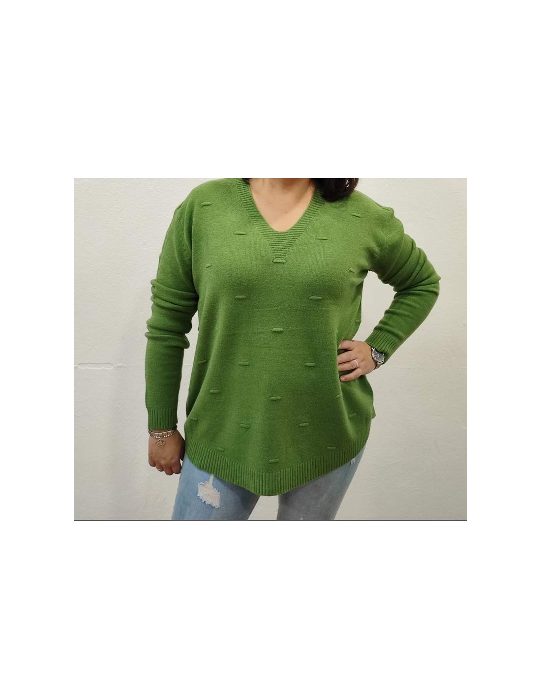blusa jersey lana, con motivos decorativos imitando nuedos